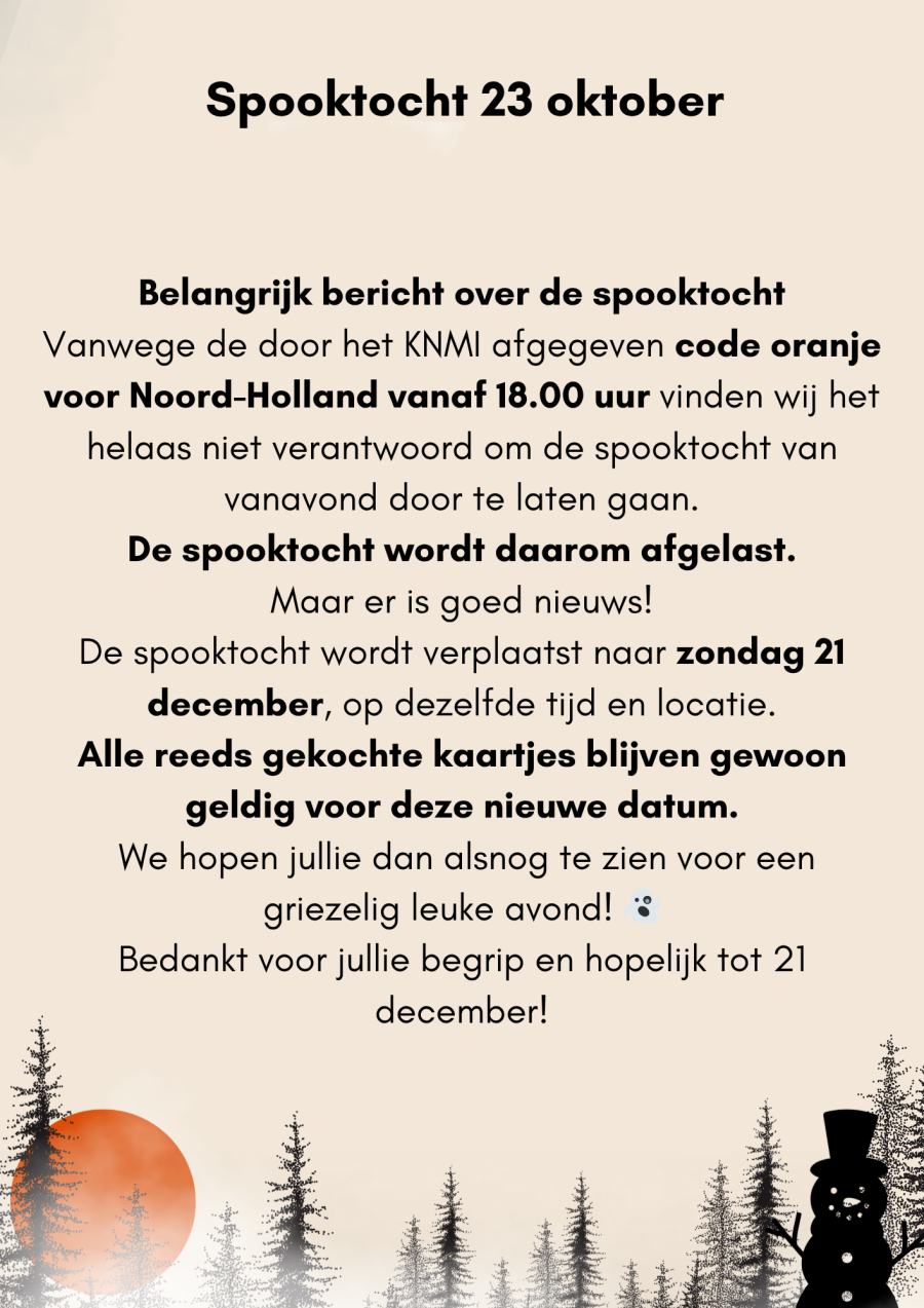 Vanwege de door het KNMI afgegeven code oranje voor Noord-Holland vanaf 18.00 uur vinden wij het helaas niet verantwoord om de spooktocht van vanavond door te laten gaan.